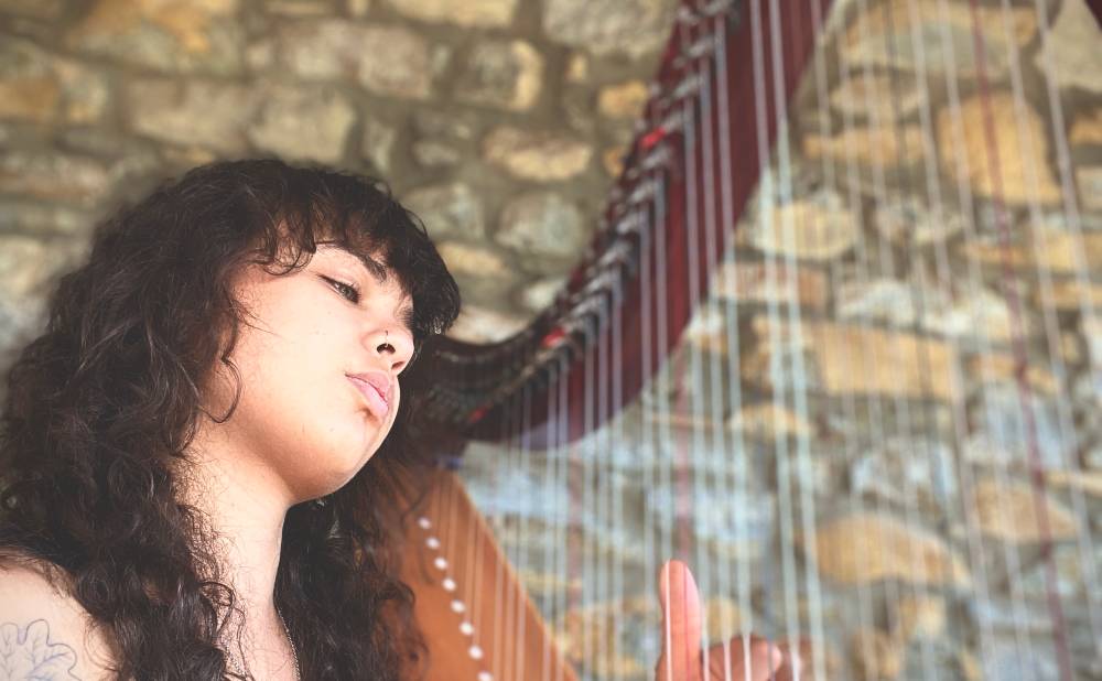 Brigitte’s deep, emotive voice weaves seamlessly with the powerful vibrations of her harp, creating a sound that is both enchanting and raw. This shift in her musical approach reflects her deep connection to the acoustic instrument, allowing her to explore the introspective themes of her songwriting with vulnerability and grace.